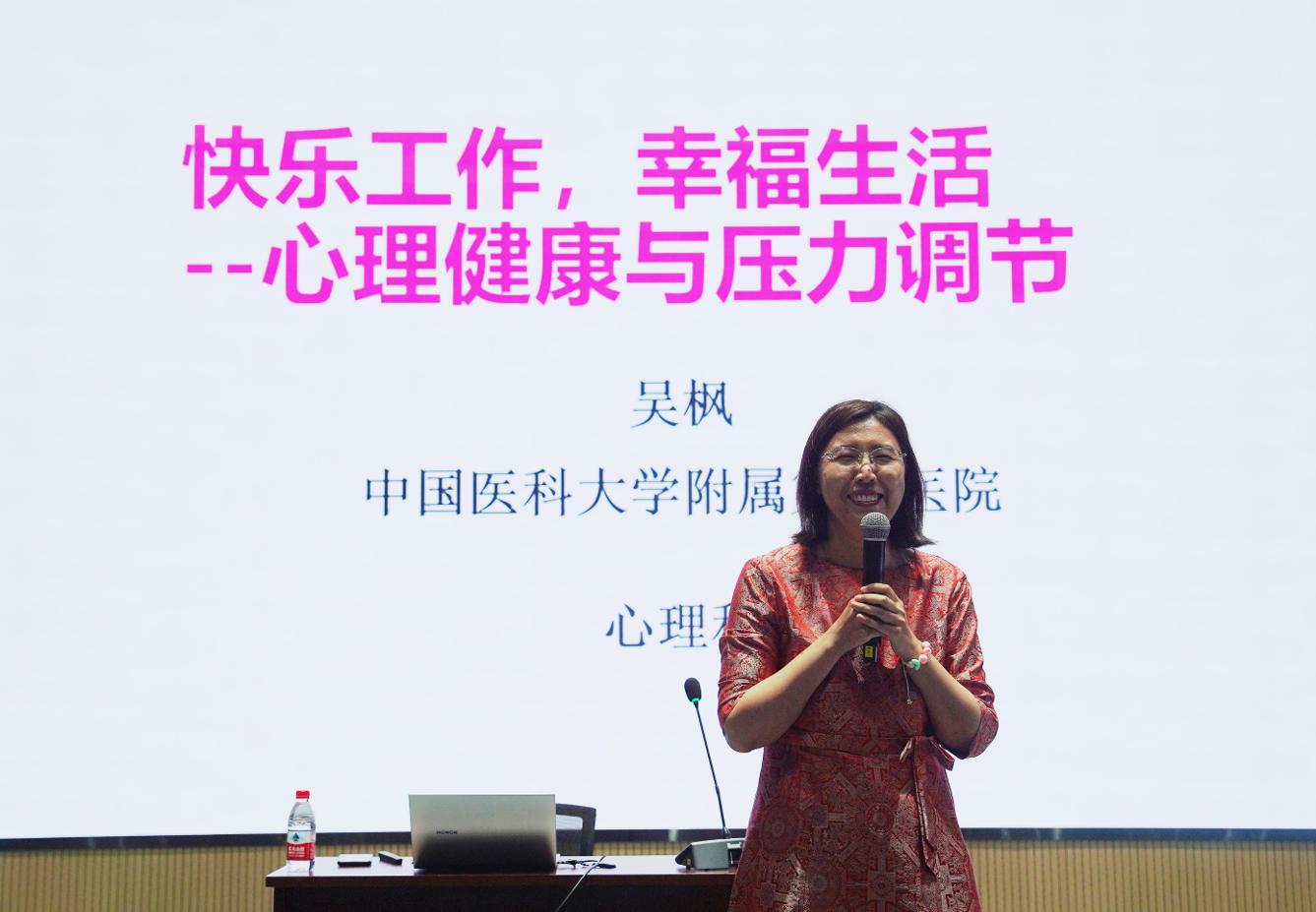 启动仪式后,,,,,,中国医科大学隶属第一医院心理科教授、主任医师吴枫为现场的100余名职工代表举行了《快乐事情,,,,,,幸福生涯——心理康健与压力调理》主题讲座。。。。。。