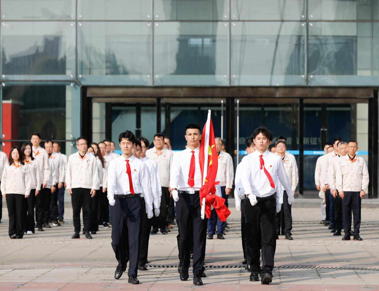 早上8点30分,,,,,,升旗仪式正式最先,,,,,,在公司主理公楼外东侧广场,,,,,,由新员工代表组成的国旗护卫队迈着铿锵有力的程序,,,,,,护送五星红旗来到国旗台,,,,,,全场肃立,,,,,,行注目礼,,,,,,高唱国歌,,,,,,目送鲜艳的五星红旗冉冉升起。。。。。。。